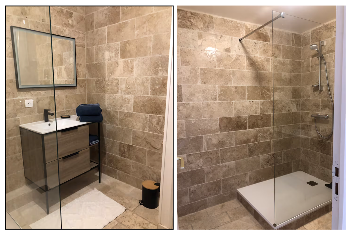 🛁 Salle de bain privative avec douche, lavabo et WC.